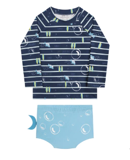 Descrição: Modelo em 2 peças - Linda camiseta manga longa e sunga e tchibum com proteção UV 50+.