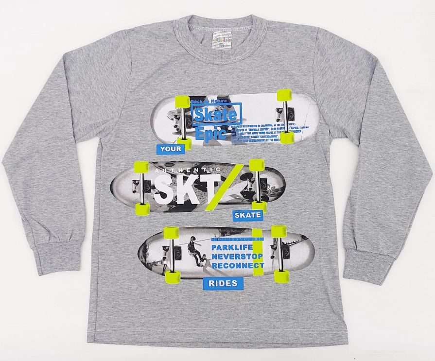 Descrição: Modelo em 1 peça- Camiseta manga longa em malha com estampa.