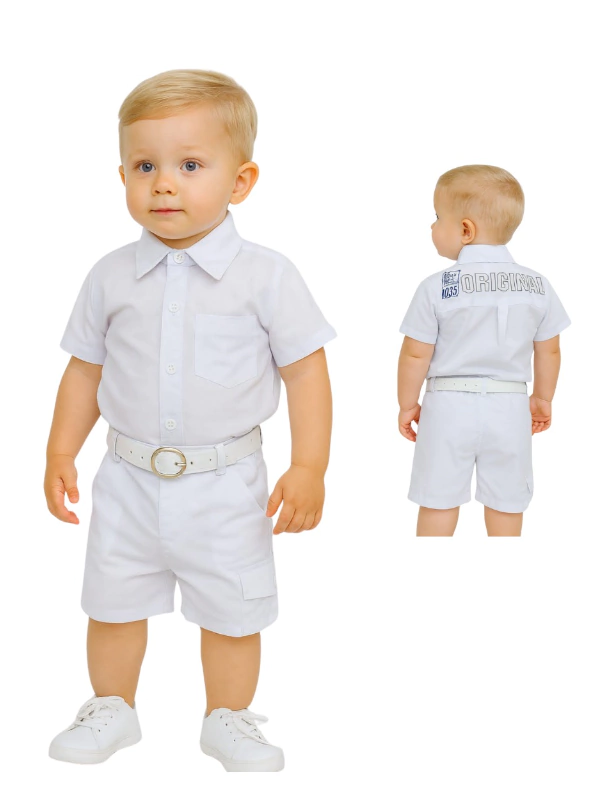 Descrição modelo em 2 peças - Camisa de manga curta e bermuda com bolso .