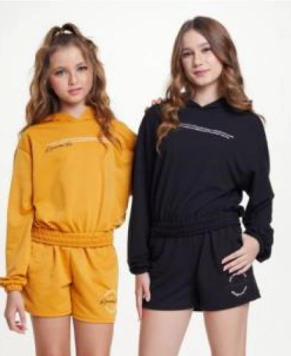 Descrição: Modelo em 2 peças - Linda blusa com capuz e short em moletinho com elastano. Composição: 96% poliester 4% elastano.