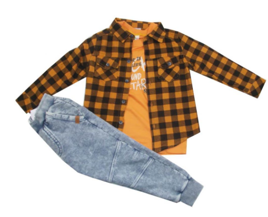 Descrição: modelo em 3 peças : linda camisa xadrez flanelada camiseta manga longa em meia malha e calça stone moletom sem felpa. Composição: 100% algodão .