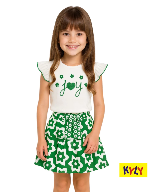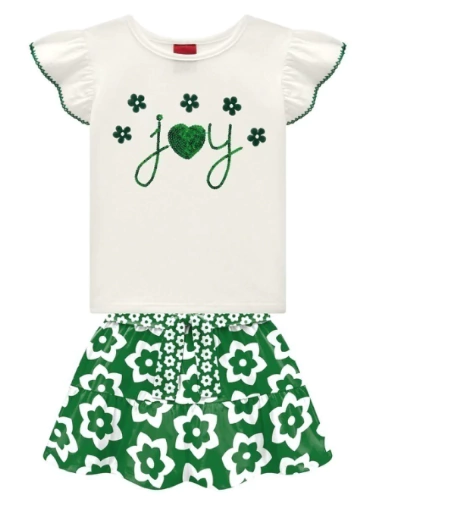 Descrição: Modelo em 2 peças - Linda blusa em malha com bordado em lantejoulas e saia em malha estampada com short interno.