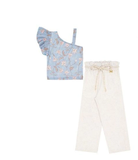 Descrição: Modelo em 2 peças- Linda blusa em tecido delicado com estampa floral e calça Wide Leg em jacquard com linho.