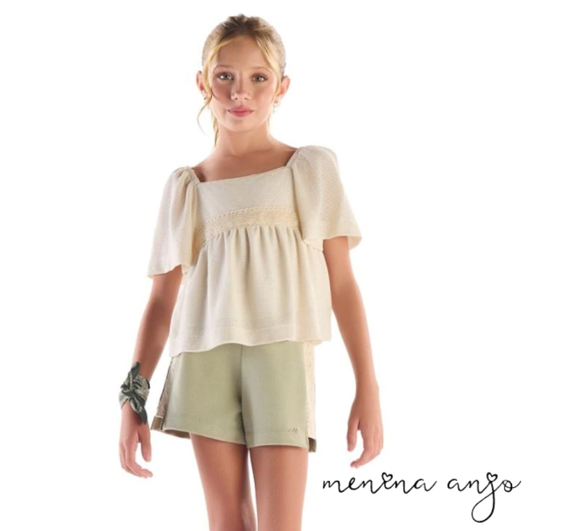 Descrição: modelo em 2 peças - Linda blusa em tecido delicado e short em moletinho com detalhe de renda