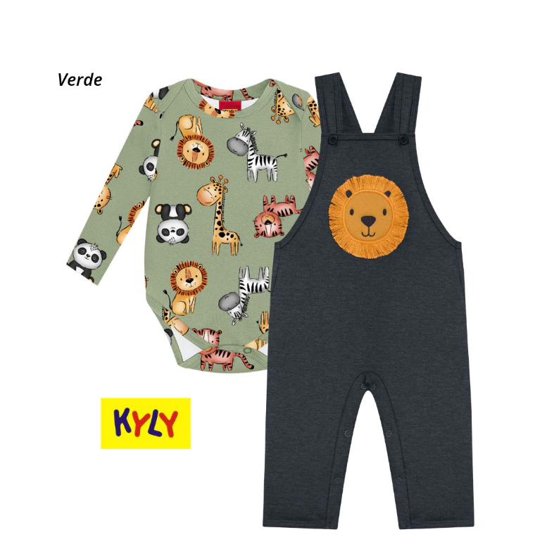 Composição: jardineira (100% Algodão ) body ( 95% algodão 5% elastano ) na cor chumbo 75% algodão 25% poliester .