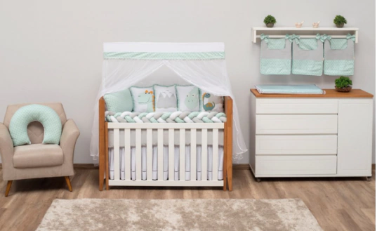 O kit berço é fundamental para a decoração do quarto, adicionando um colorido especial e proporcionando um ambiente confortável e seguro para o bebê.