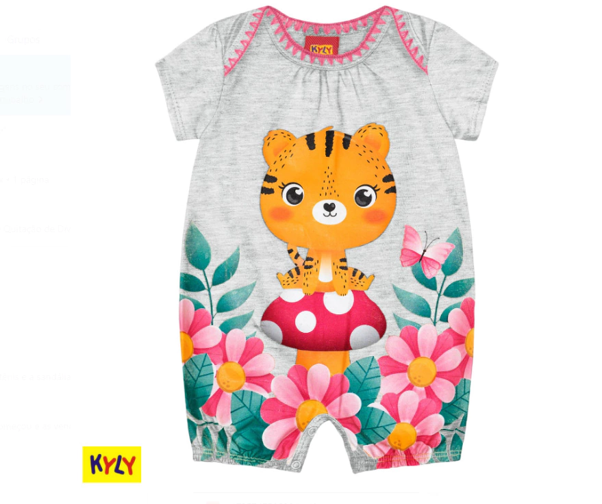 Os detalhes incluem estampa localizada de tigre fofinho na frente e nas costas, decote redondo com acabamento em ponto picueta, um charme especial. Mangas curtas com acabamento em debrum, barra com elástico rebatido e entrepernas com aberturas e botões para fechamento, facilitando as trocas de fraldas.