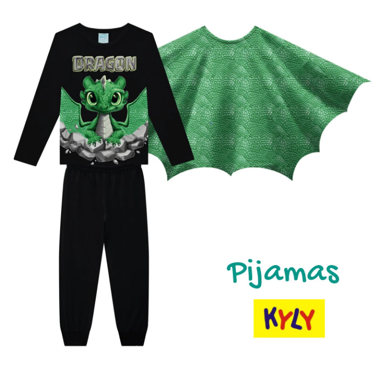 A calça básica 100% algodão garante liberdade para se movimentar, mas o grande destaque desse pijama é a capa com asas de dragão 95% poliéster e 5% elastano, que adiciona um toque de fantasia e faz a imaginação voar alto! Perfeito para os pequenos aventureiros que querem dormir como verdadeiros guardiões do reino!