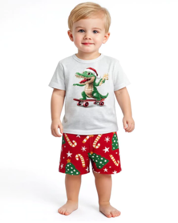 Um Natal divertido e cheio de estilo! O pijama infantil menino Kyly ,oferecendo conforto, maciez e leveza para noites tranquilas e cheias de imaginação. A camiseta possui modelagem tradicional, com mangas curtas e decote redondo, garantindo praticidade e caimento perfeito. A estampa localizada é o grande destaque, um jacaré animado de gorro natalino, sobre um skate e segurando um doce, com efeito que brilha no escuro, trazendo um toque mágico na hora de dormir.
