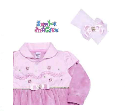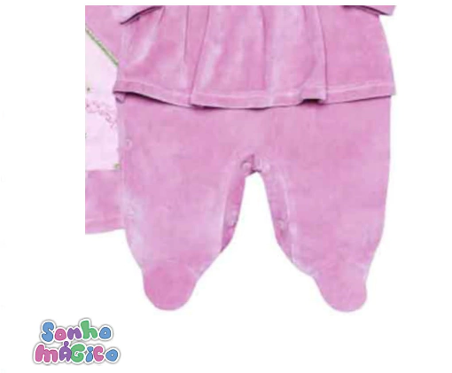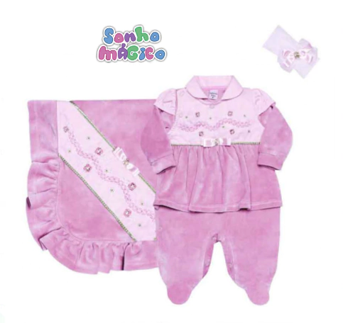Descricao modelo em 3 pecas - Macacao em plush combinando com a manta com detalhe em fustao com bordado e acompanha uma faixa de cabelo.