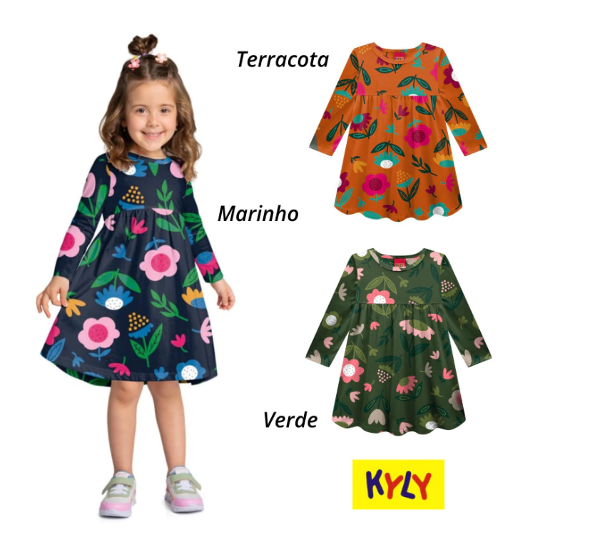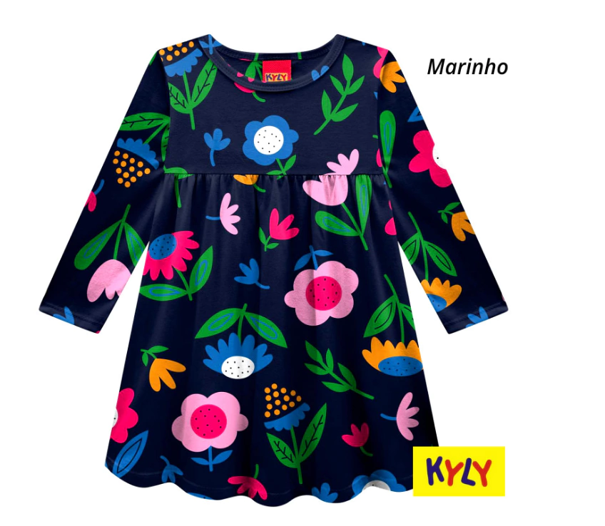 Vestido Kyly Descrição: Modelo em 1 peça - Lindo vestido manga longa estampado em malha. Composição: 100% algodão . TABELA ORIENTATIVA DE TAMANHOS: 4 - 3 a 4 anos