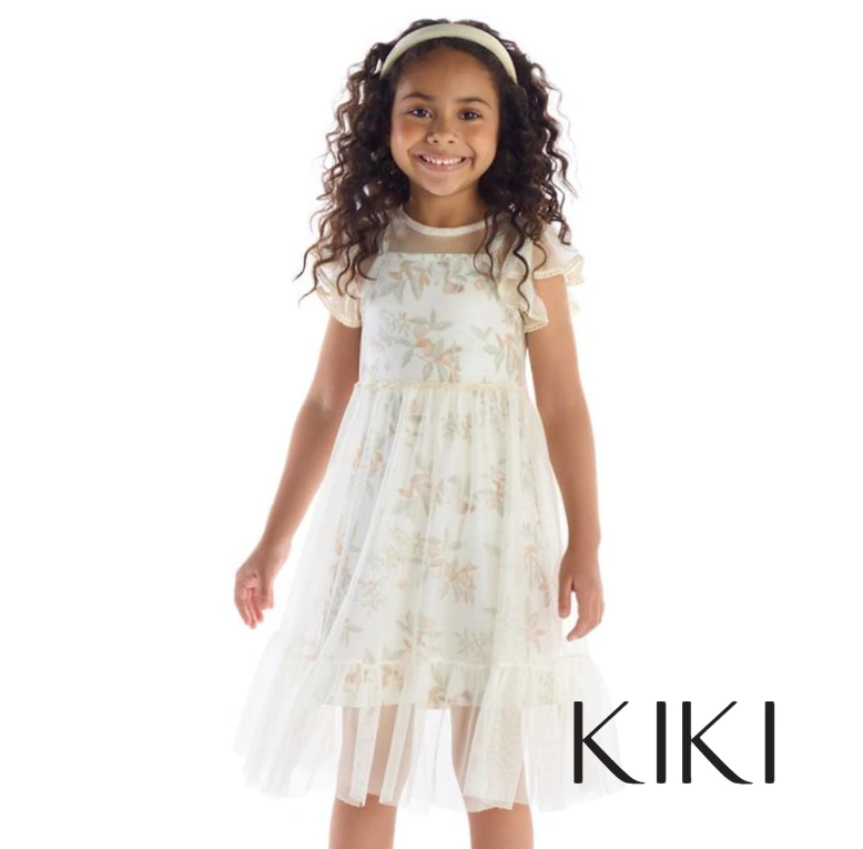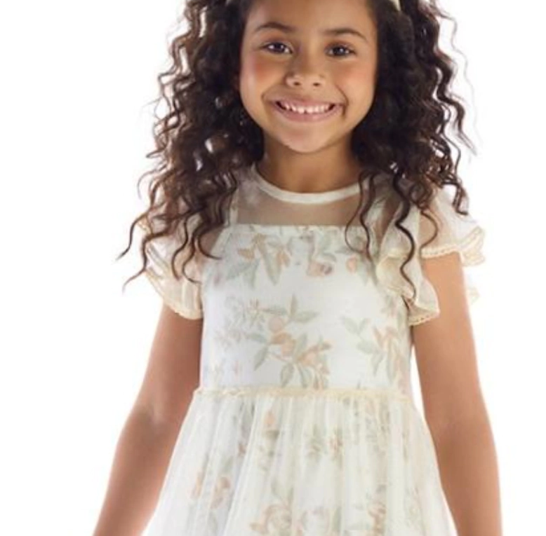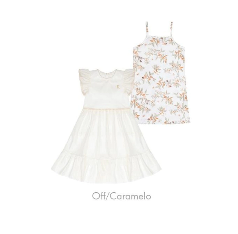 Descrição: Modelo em 2 peças- Lindo vestido de alça com estampa delicada para usar por baixo e um vestido de tule de mangas curtas pra usar sobreposto.